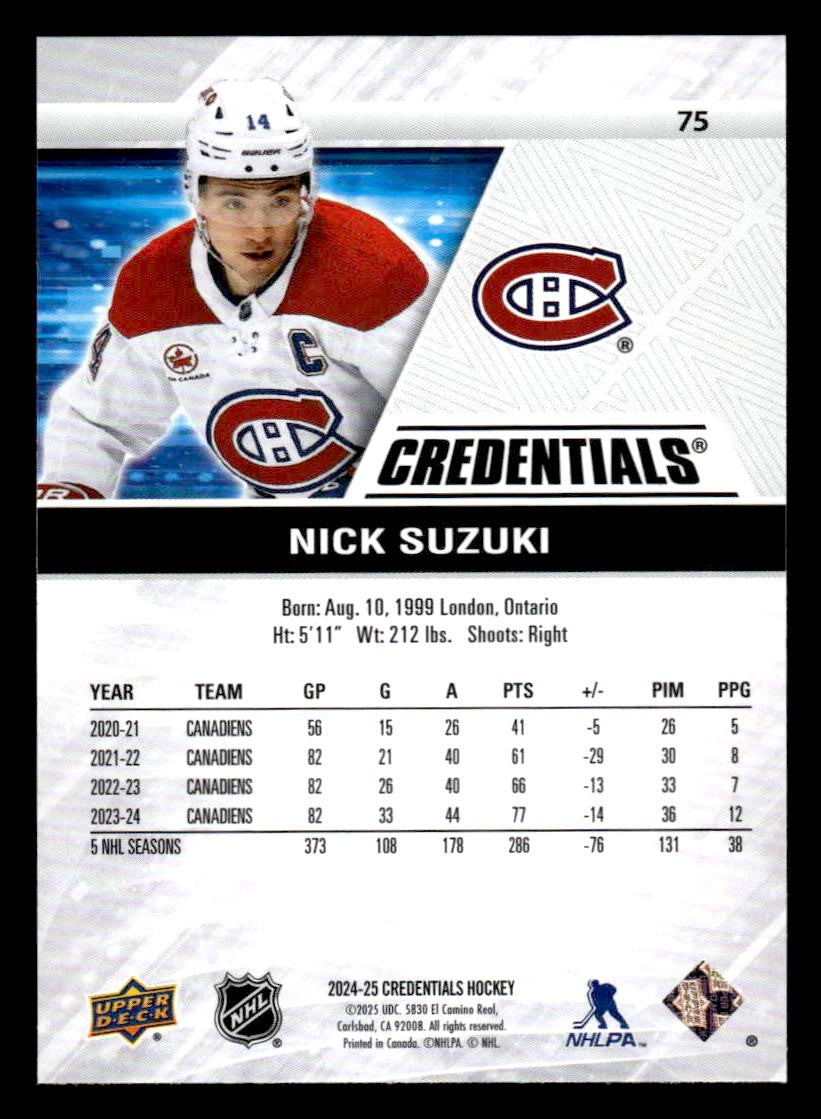 This is a sharp example of the 2024-25 Upper Deck Credentials #75 featuring Nick Suzuki.