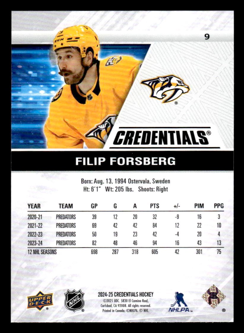 This is a sharp example of the 2024-25 Upper Deck Credentials #9 featuring Filip Forsberg.