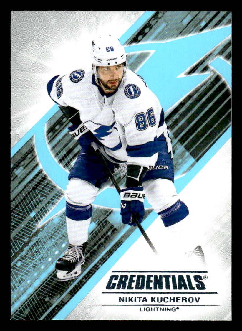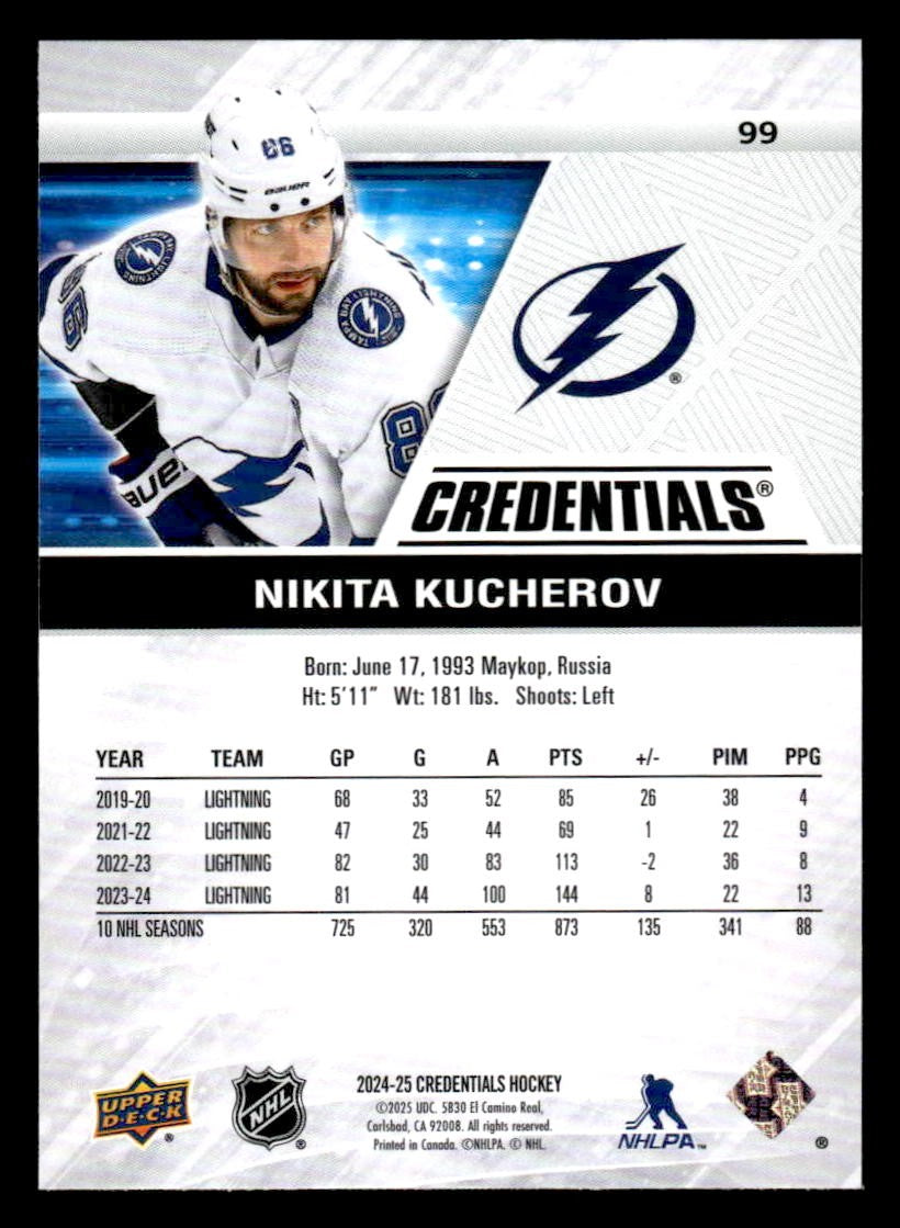 This is a sharp example of the 2024-25 Upper Deck Credentials #99 featuring Nikita Kucherov.