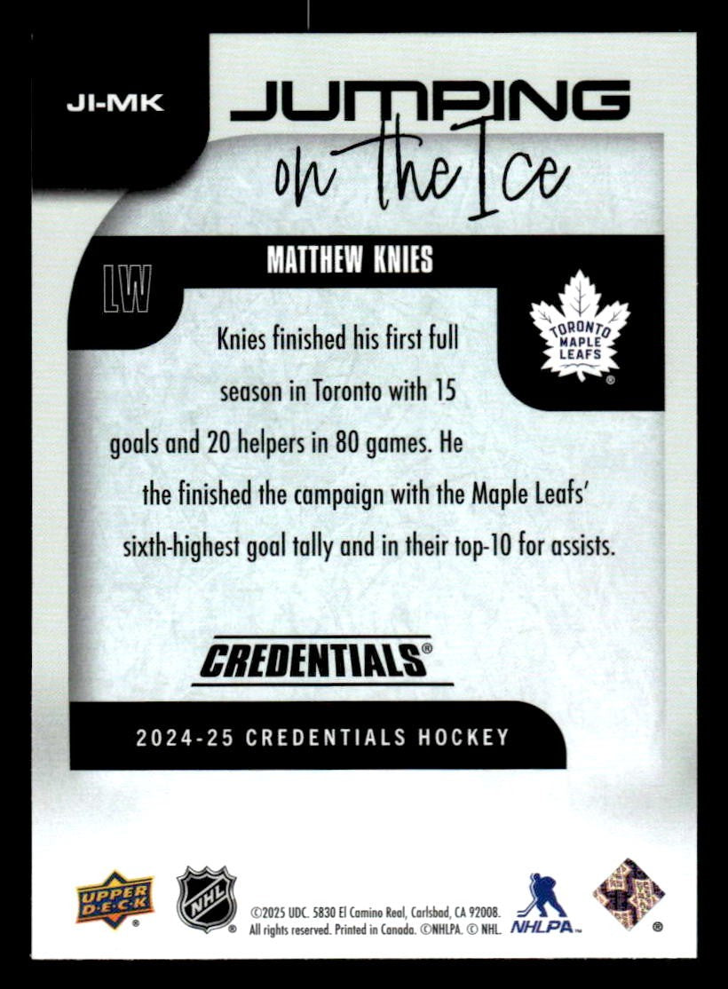 This is a sharp example of the 2024-25 Upper Deck Credentials #JI-MK featuring Matthew Knies.