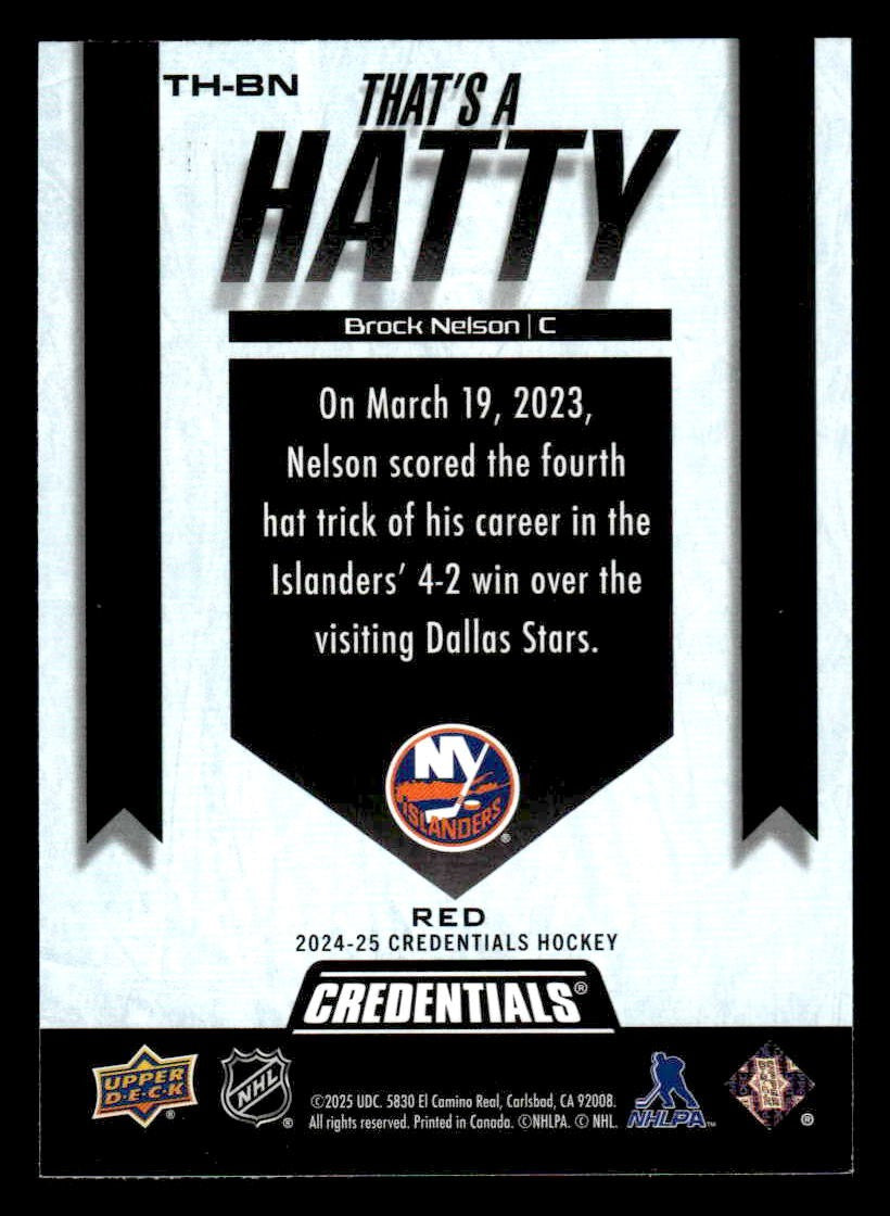 Brock Nelson β 2024 Upper Deck 2024-25 Upper Deck Credentials That's A Hatty Red #083/149