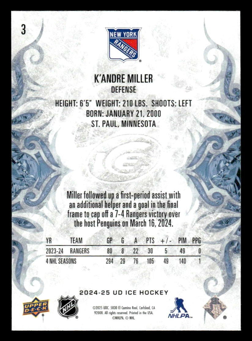 This is a nice example of a 2024-25 Upper Deck Ice #3 K'Andre Miller
