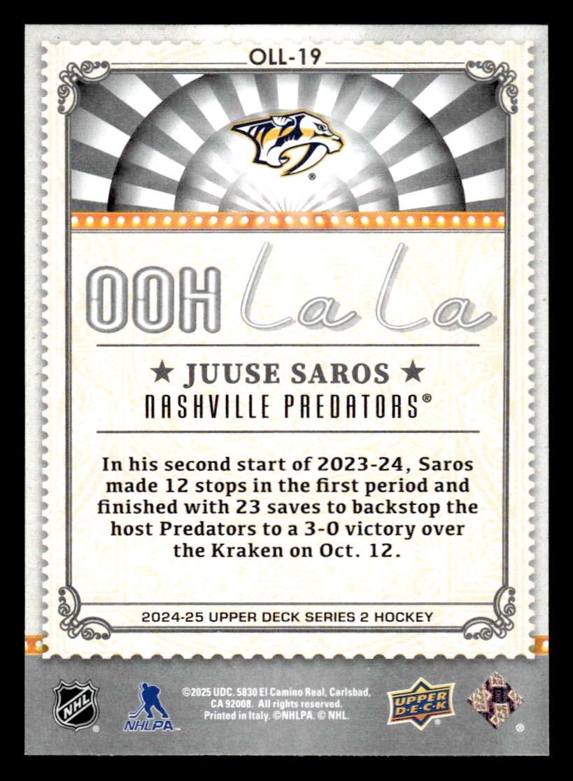 This is a nice example of a 2024-25 Upper Deck #OLL-19 Juuse Saros Ooh La La