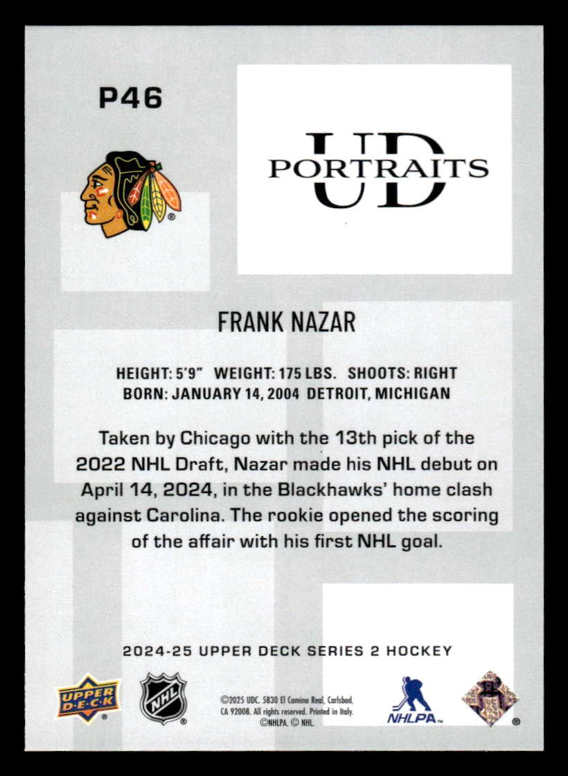 This is a nice example of a 2024-25 Upper Deck #P-46 Frank Nazar UD Portraits