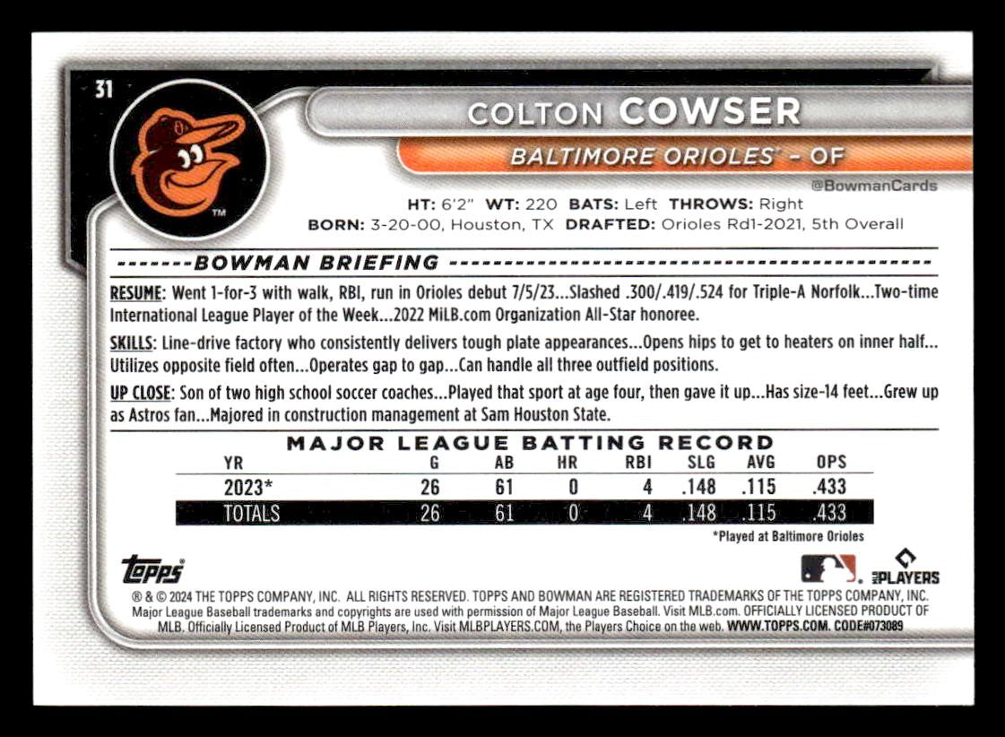 This is a nice example of a 2024 Bowman #31 Colton Cowser