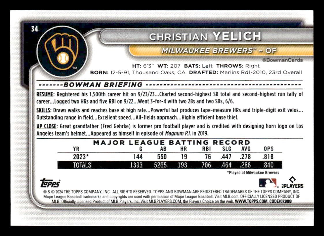 This is a nice example of a 2024 Bowman #34 Christian Yelich