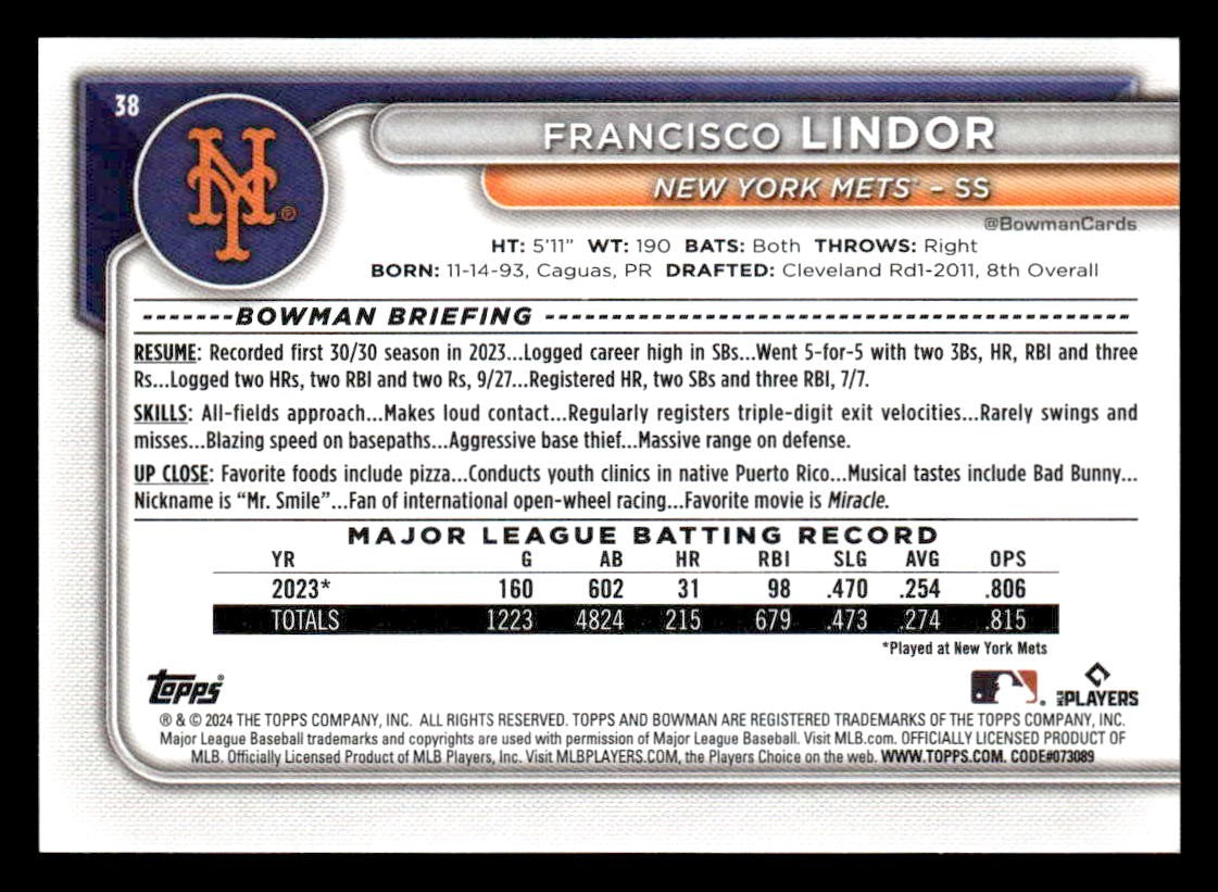 This is a nice example of a 2024 Bowman #38 Francisco Lindor