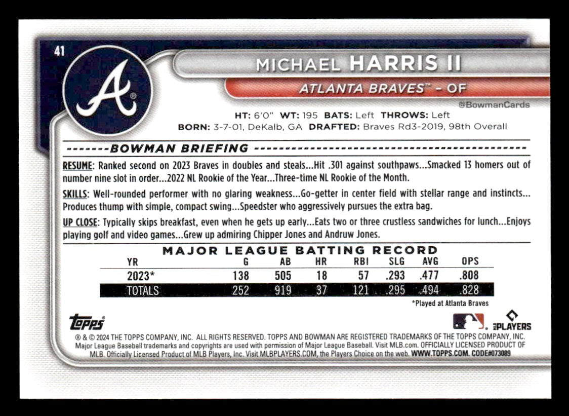 This is a nice example of a 2024 Bowman #41 Michael Harris II