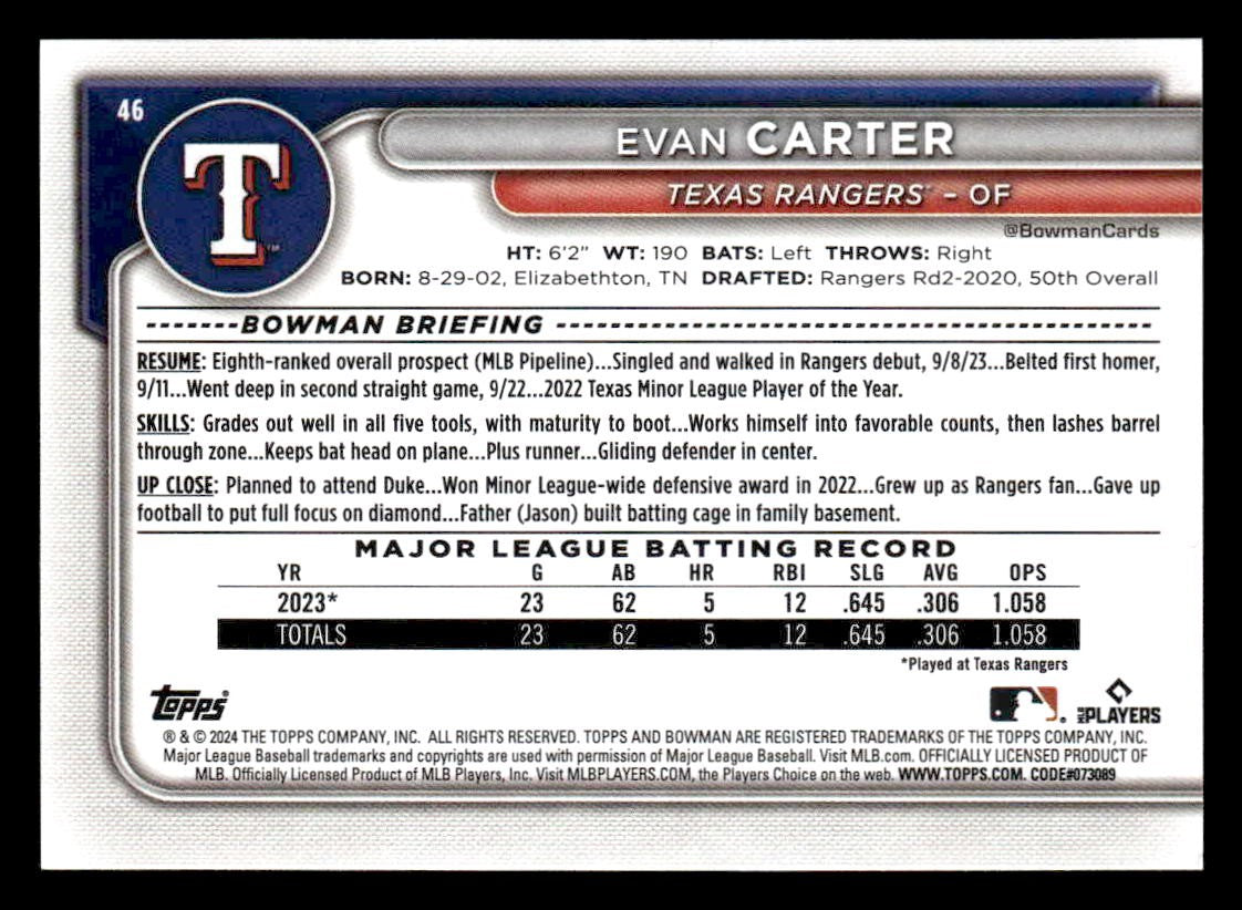 This is a nice example of a 2024 Bowman #46 Evan Carter