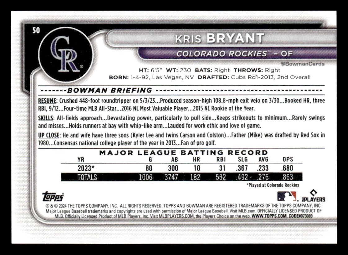 This is a nice example of a 2024 Bowman #50 Kris Bryant