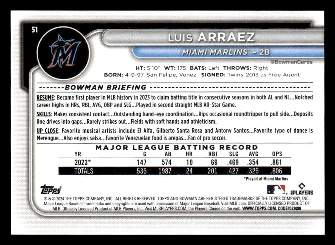 This is a nice example of a 2024 Bowman #51 Luis Arraez