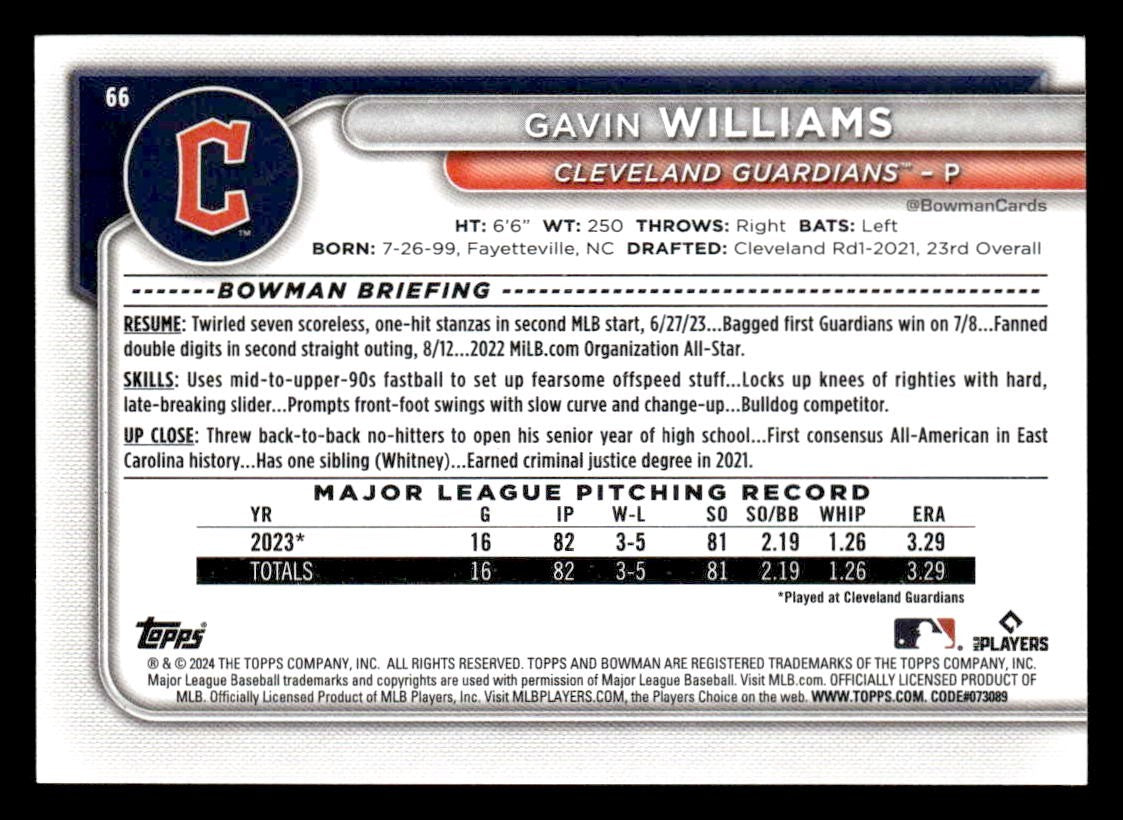 This is a nice example of a 2024 Bowman #66 Gavin Williams