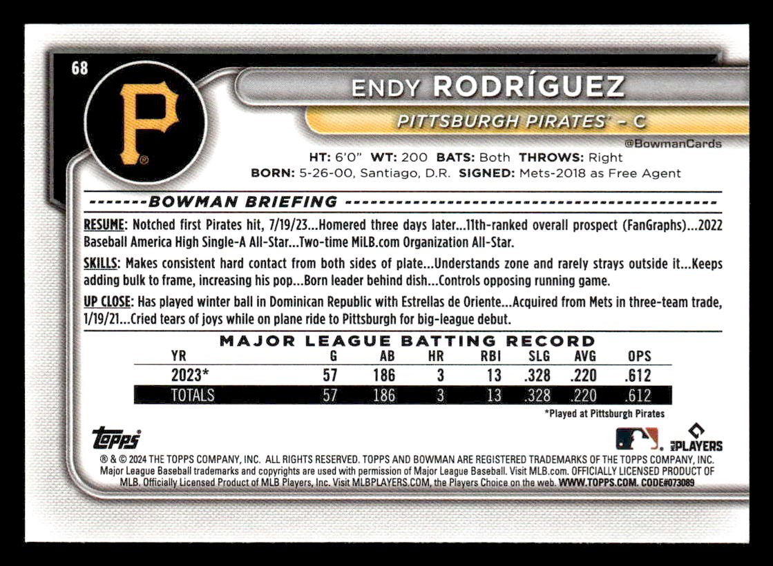 This is a nice example of a 2024 Bowman #68 Endy Rodríguez