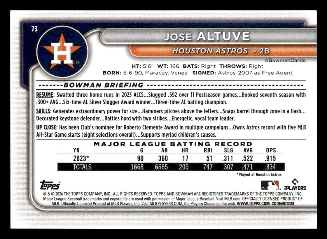 This is a nice example of a 2024 Bowman #73 Jose Altuve