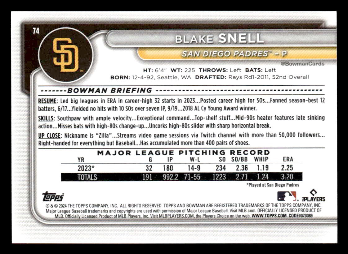 This is a nice example of a 2024 Bowman #74 Blake Snell