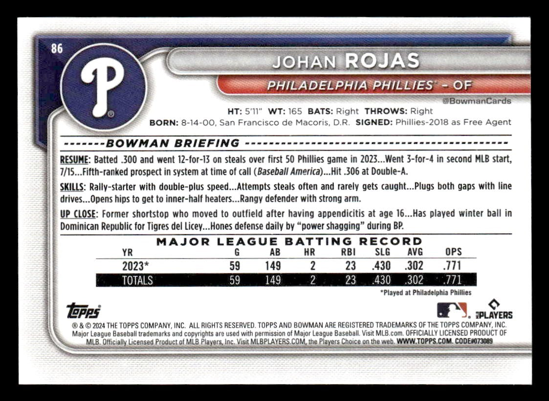 This is a nice example of a 2024 Bowman #86 Johan Rojas