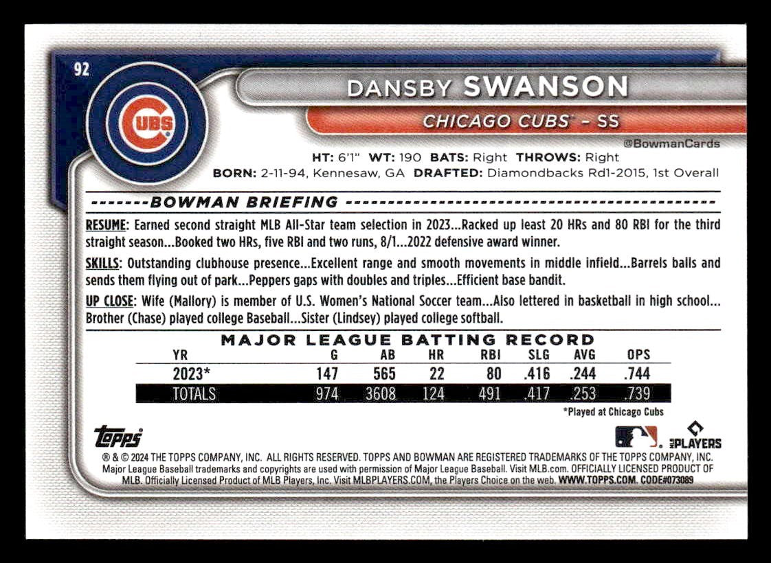This is a nice example of a 2024 Bowman #92 Dansby Swanson