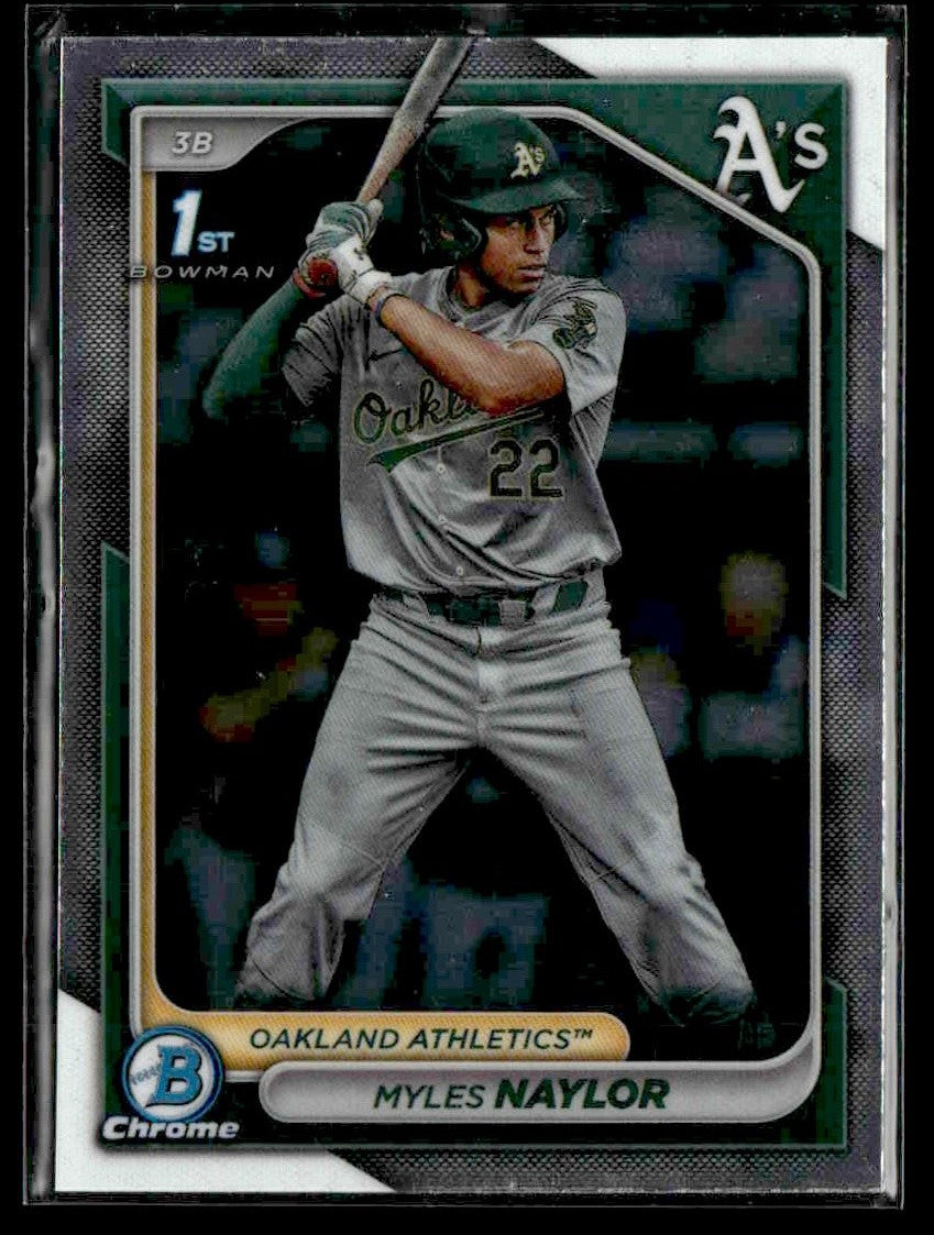 Myles Naylor — 2024 Bowman Chrome Prospects #BCP-136🔥 A premium from the 2024 Bowman release featuring Myles Naylor of the Oakland Athletics.📌 Card Highlights:- Insert / Parallel: Chrome Prospects - Serial Number: - Team: Oakland Athletics- Year: 2024- Attributes: - Rookie Card: - Autograph: - Condition: Near Mint or Better (see photos for details)🛡️ Why Buy From Us:✔️ Ships securely with tracking & insurance ✔️ 100% authentic cards - no reprints or fakes ✔️ Open to offers & bundle deals with other cards in our store Perfect for collectors chasing rookies, SSPs, or stars from the diamond, this Bowman 2024 Bowman card is a sharp addition to any baseball collection. Don't miss the chance to secure it for your PC or investment portfolio today!Baseball