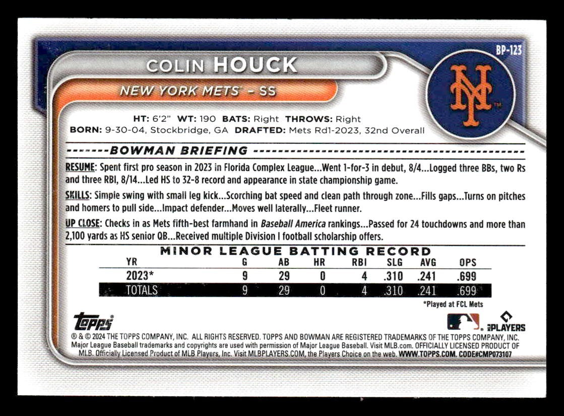 This is a nice example of a 2024 Bowman #BP-123 Colin Houck Prospects