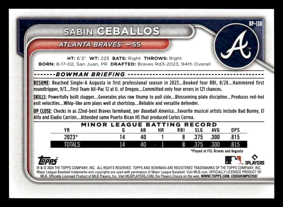 This is a nice example of a 2024 Bowman #BP-130 Sabin Ceballos Prospects