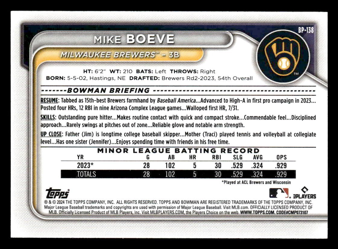 This is a nice example of a 2024 Bowman #BP-138 Mike Boeve Prospects
