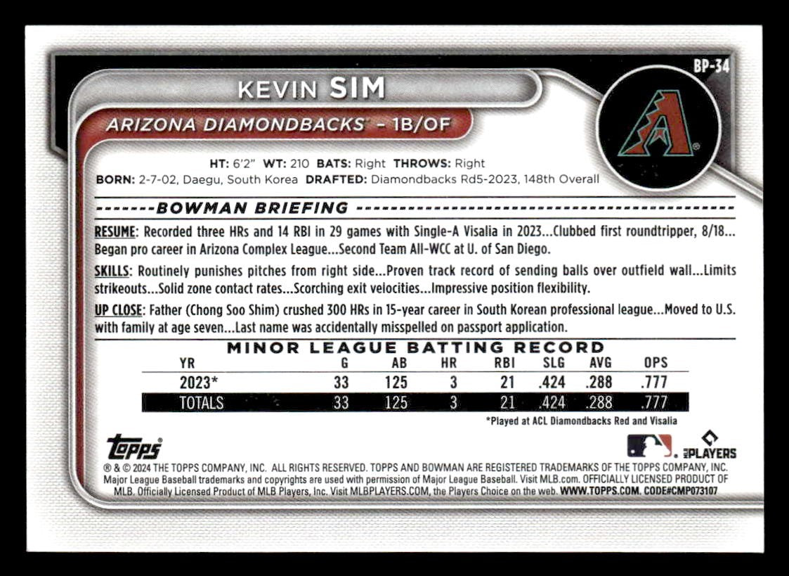 This is a nice example of a 2024 Bowman #BP-34 Kevin Sim Prospects