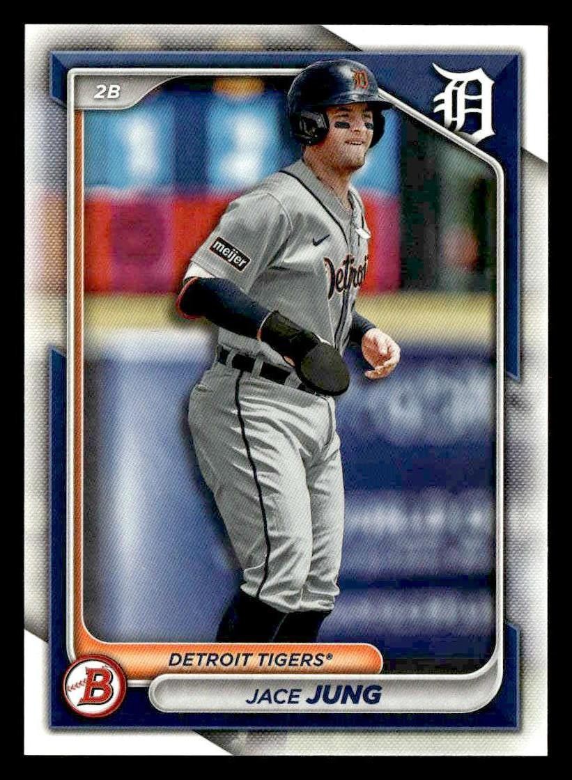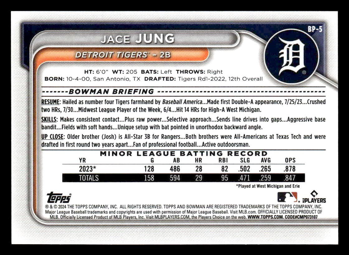 This is a nice example of a 2024 Bowman #BP-5 Jace Jung Prospects