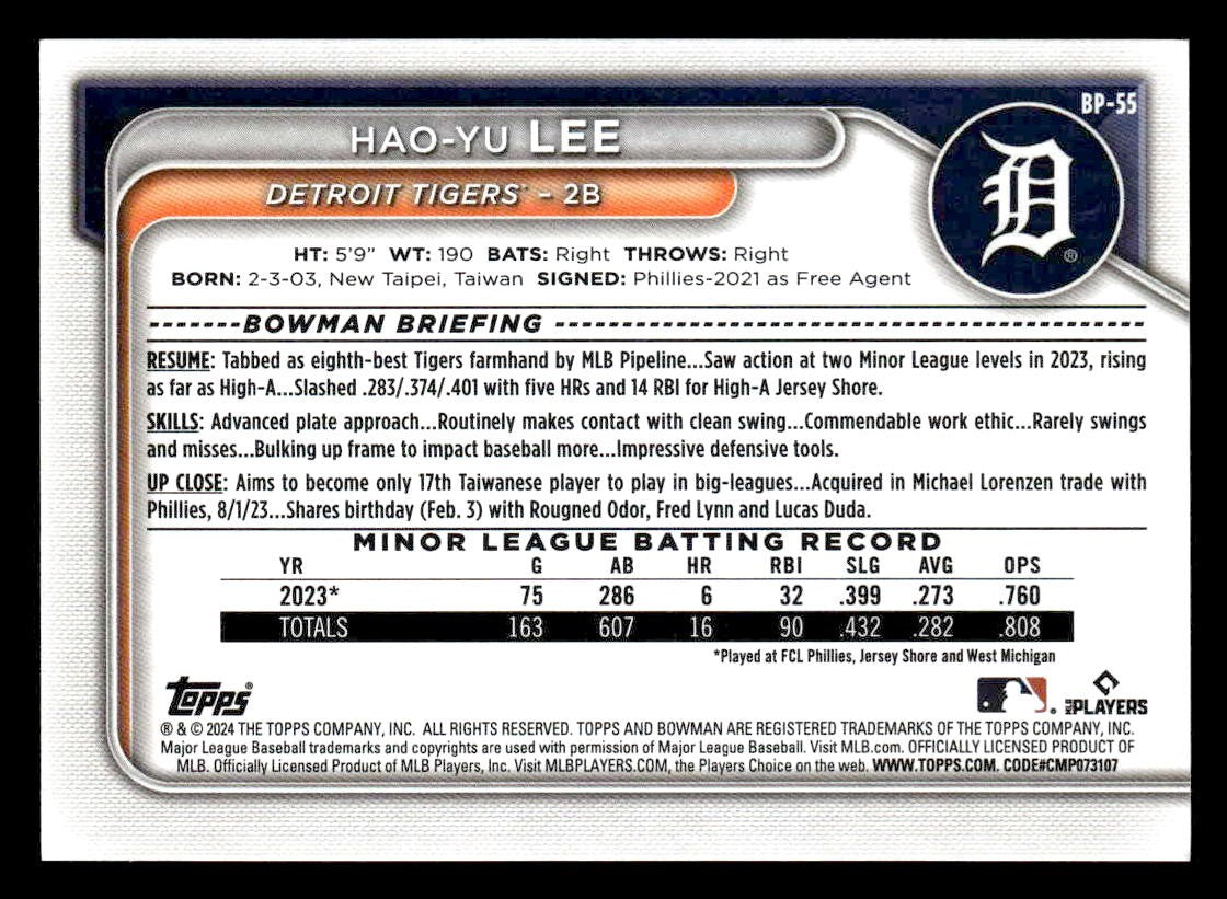 2024 Bowman #BP-55 Hao-Yu Lee Prospects