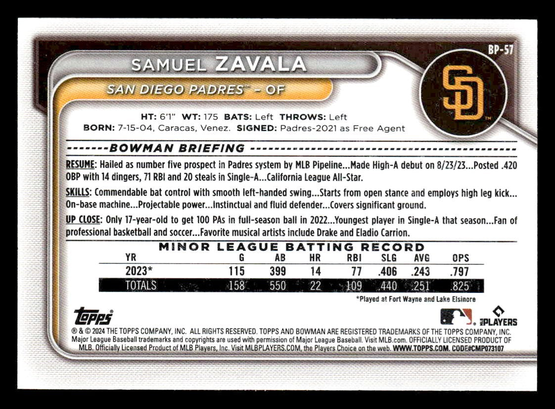 This is a nice example of a 2024 Bowman #BP-57 Samuel Zavala Prospects