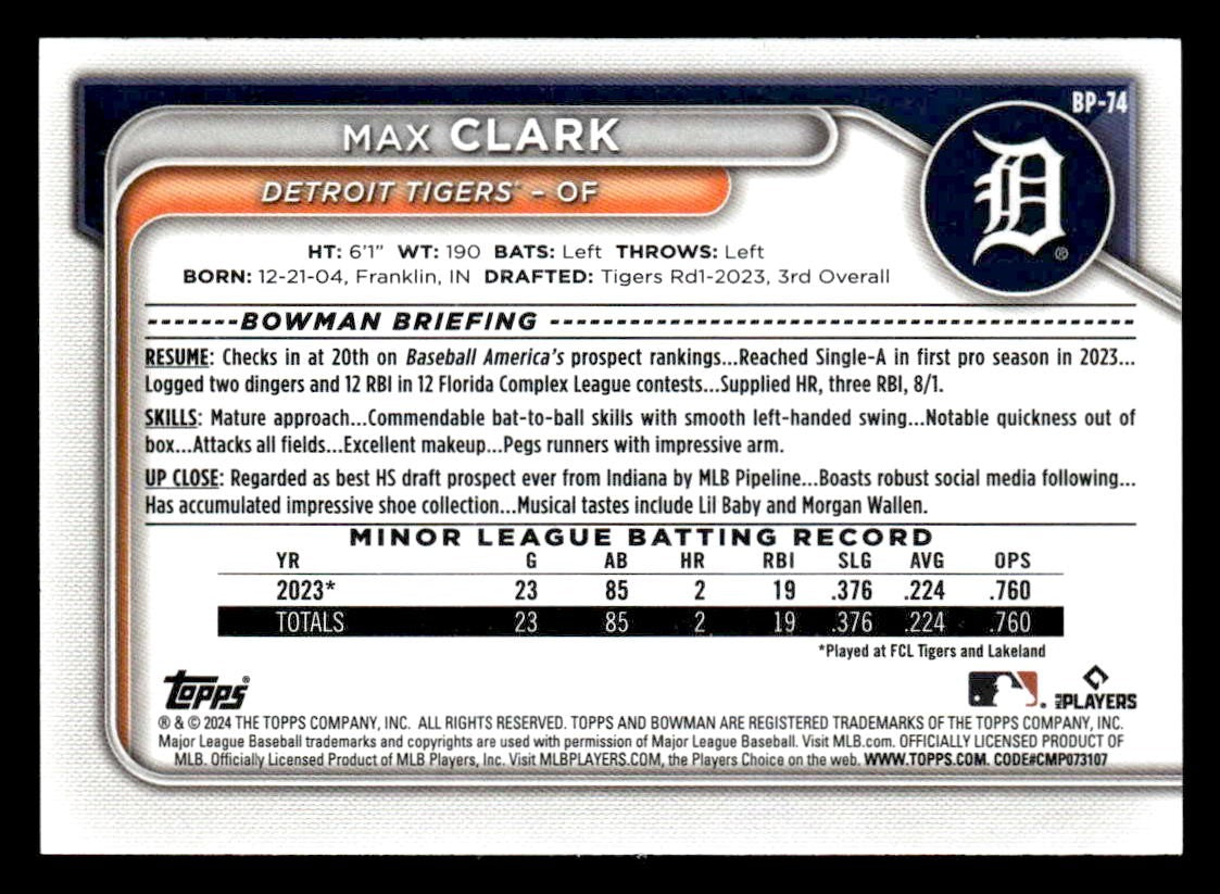 This is a nice example of a 2024 Bowman #BP-74 Max Clark Prospects