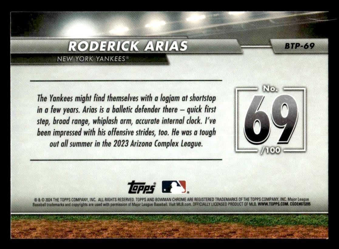 This is a nice example of a 2024 Bowman #BTP-69 Roderick Arias Bowman Scouts' Top 100