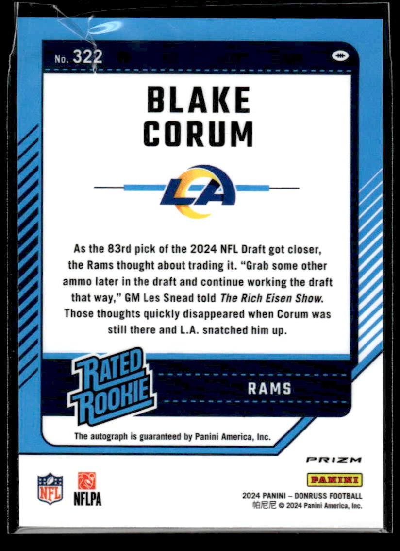 Blake Corum played for the Los Angeles Rams in 2024, and this card is a standout from the Donruss 2024 Donruss release. Whether you're chasing rookies, SSPs, or building a premium collection, this card delivers.