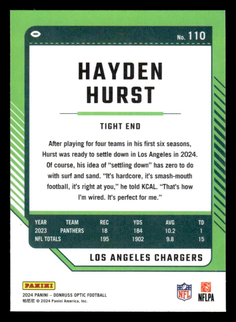 Hayden Hurst played for the Los Angeles Chargers in 2024, and this card is a standout from the Optic 2024 Donruss Optic release. Whether you're chasing rookies, SSPs, or building a premium collection, this card delivers.
