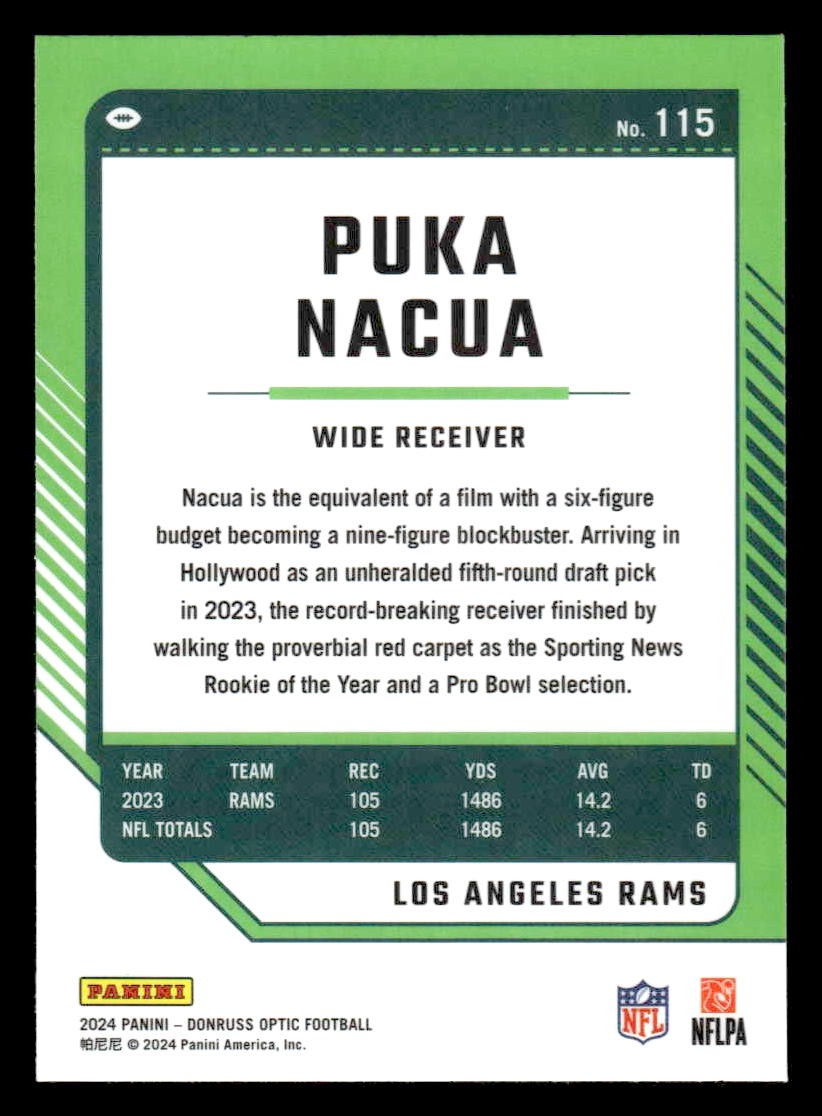 This is a sharp example of the 2024 Donruss Optic #115 featuring Puka Nacua.