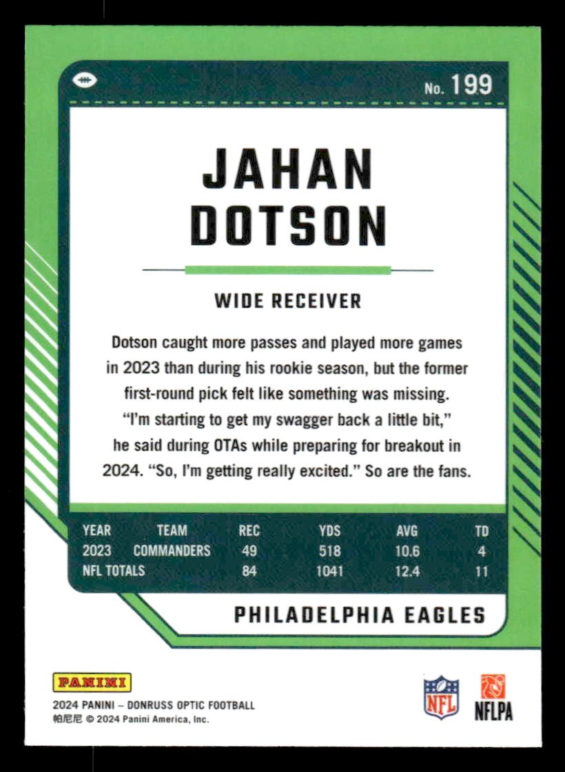 This is a sharp example of the 2024 Donruss Optic #199 featuring Jahan Dotson.