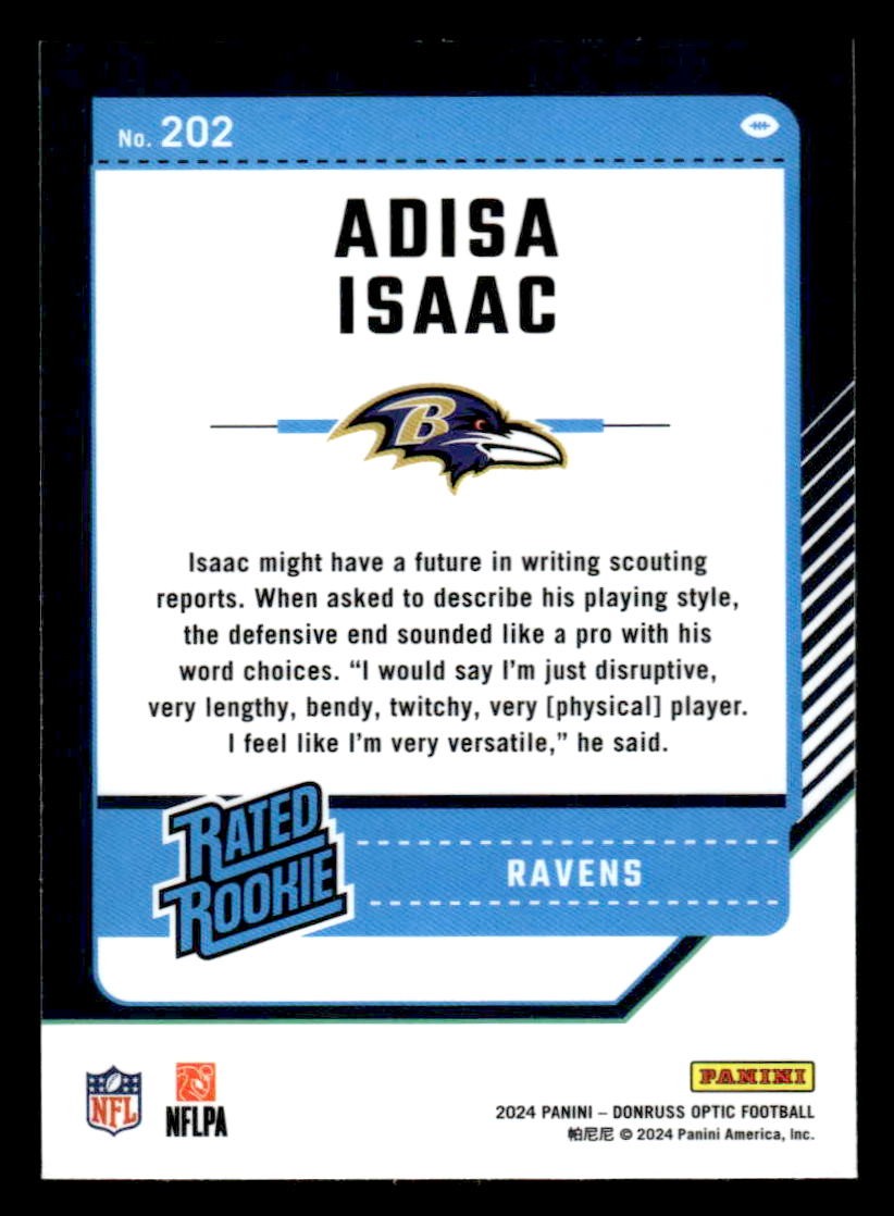 Adisa Isaac played for the Baltimore Ravens in 2024, and this card is a standout from the Donruss 2024 Donruss Optic release. Whether you're chasing rookies, SSPs, or building a premium collection, this card delivers.