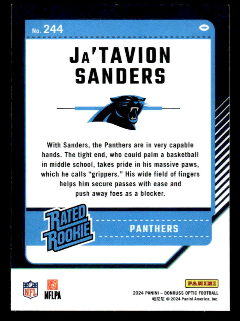 This is a sharp example of the 2024 Donruss Optic #244 featuring Ja'Tavion Sanders.