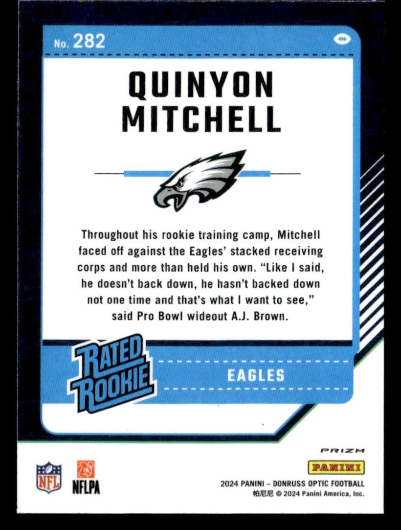 This is a sharp example of the 2024 Donruss Optic #282 featuring Quinyon Mitchell.
