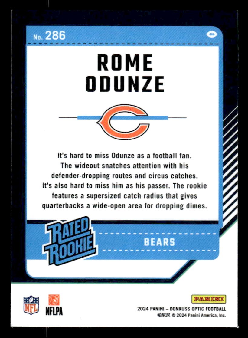 This is a sharp example of the 2024 Donruss Optic #286 featuring Rome Odunze.