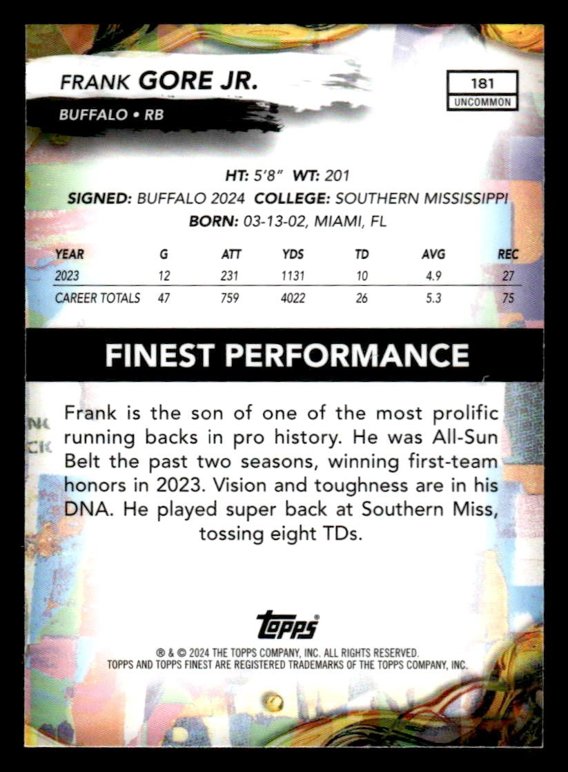 This is a nice example of a 2024 Finest #181 Frank Gore Jr. Checkerboard Refractor