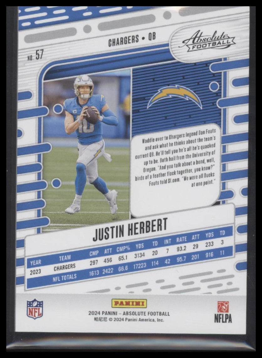 This is a nice example of a 2024 Panini Absolute #57 Justin Herbert Spectrum