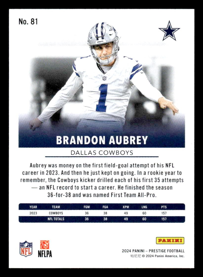This is a nice example of a 2024 Panini Prestige #81 Brandon Aubrey