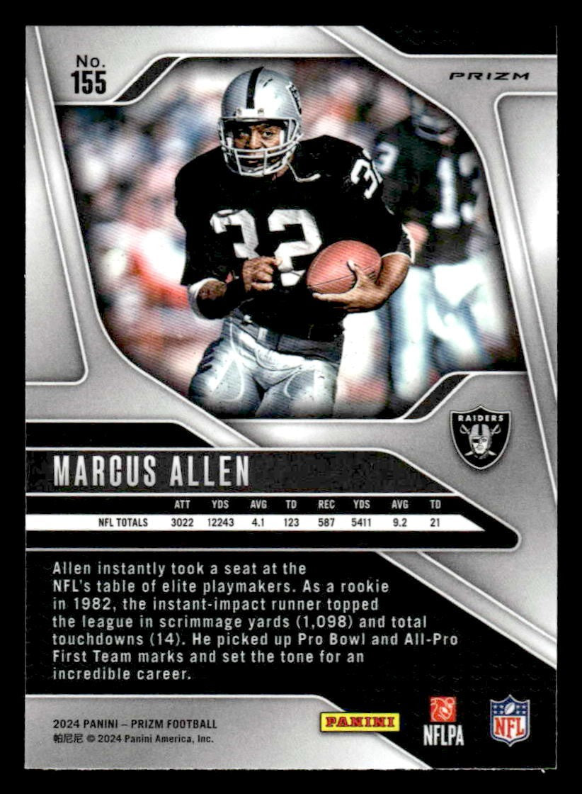 This is a sharp example of the 2024 Panini Prizm #155 featuring Marcus Allen.