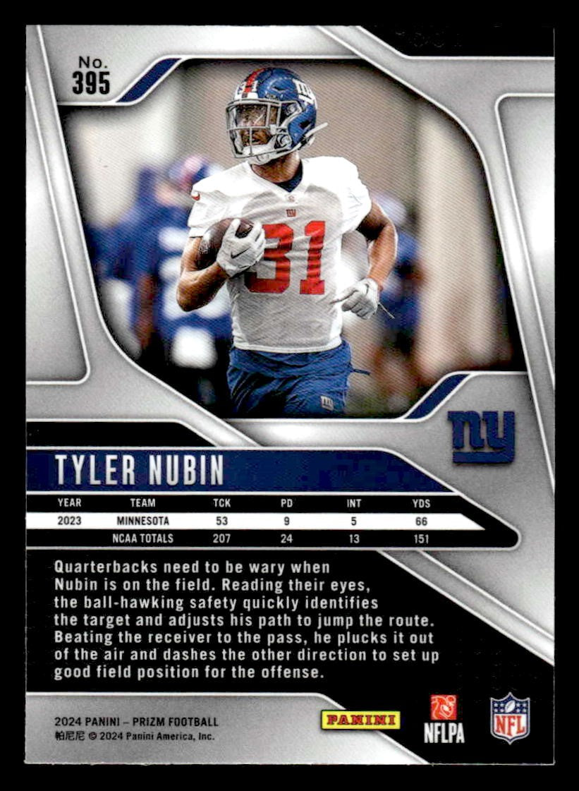 This is a sharp example of the 2024 Panini Prizm #395 featuring Tyler Nubin.
