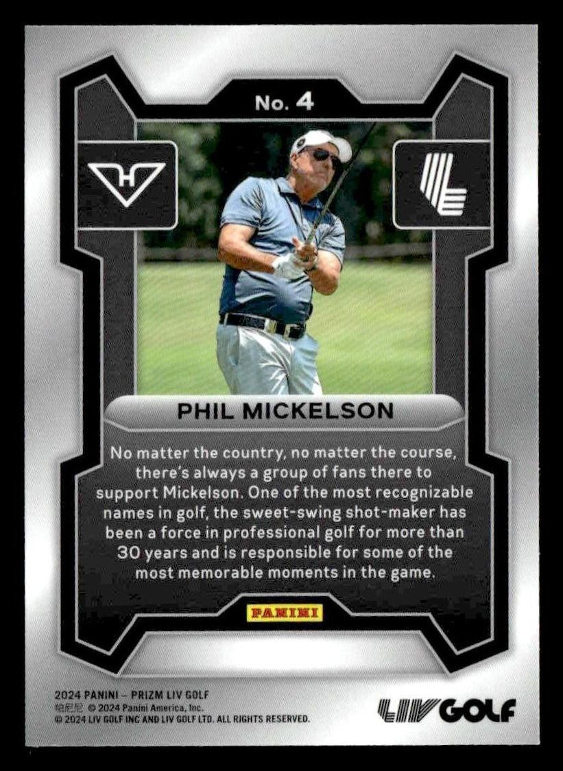 This is a nice example of a 2024 Panini Prizm LIV #4 Phil Mickelson