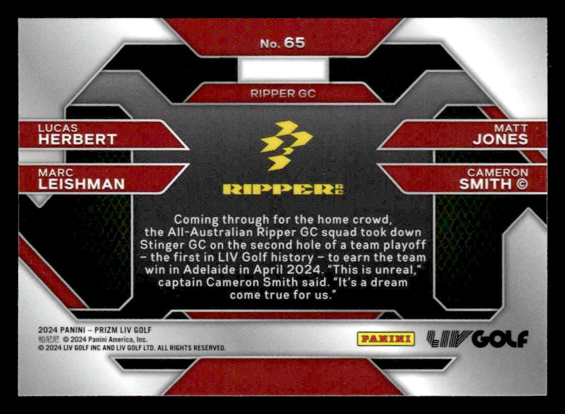 This is a nice example of a 2024 Panini Prizm LIV #65 Lucas Herbert / Marc Leishman / Cameron Smith / Matt Jones