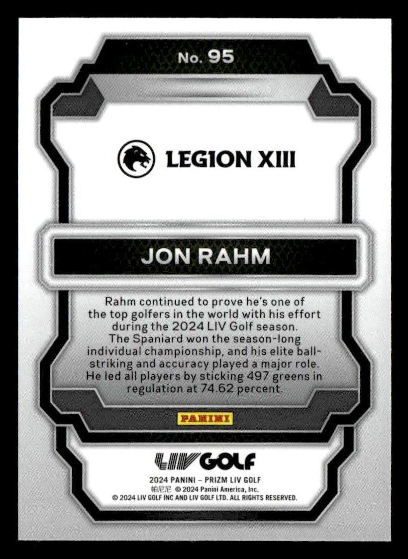 This is a nice example of a 2024 Panini Prizm LIV #95 Jon Rahm Statistical Leaders