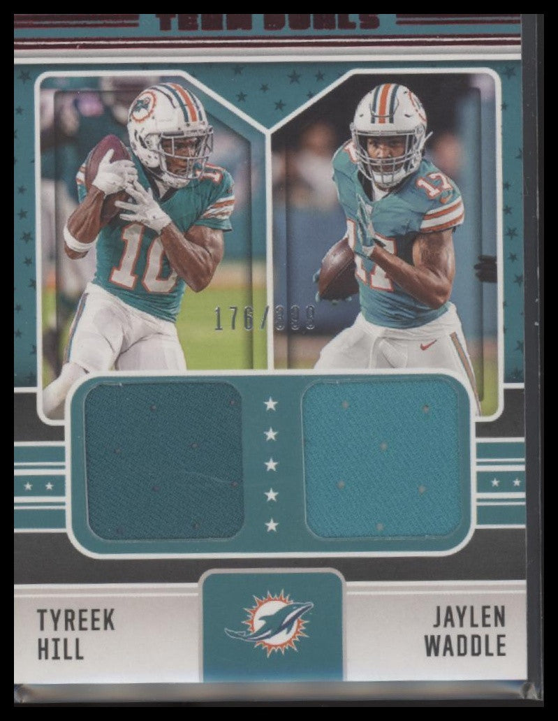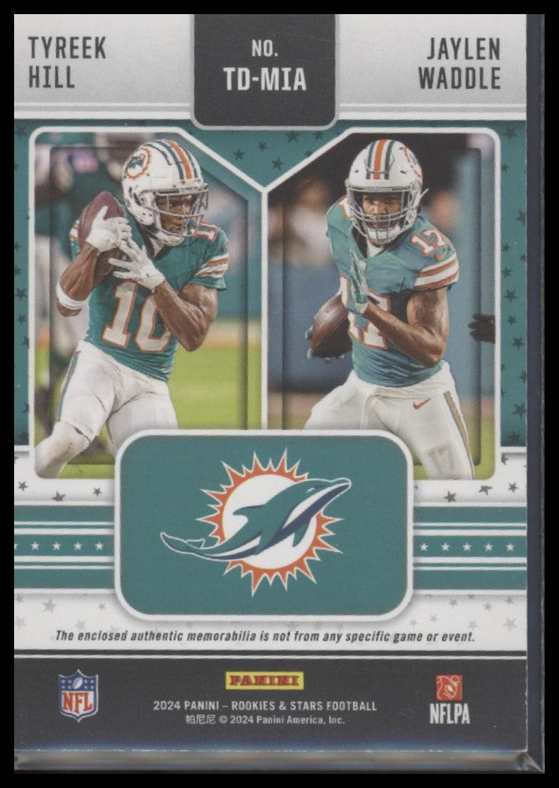 This is a nice example of a 2024 Panini Rookies & Stars #TD-MIA Tyreek Hill / Jaylen Waddle Team Duals
