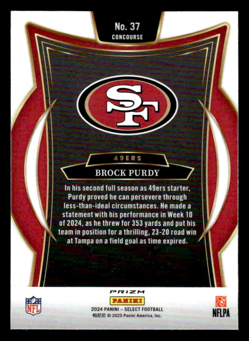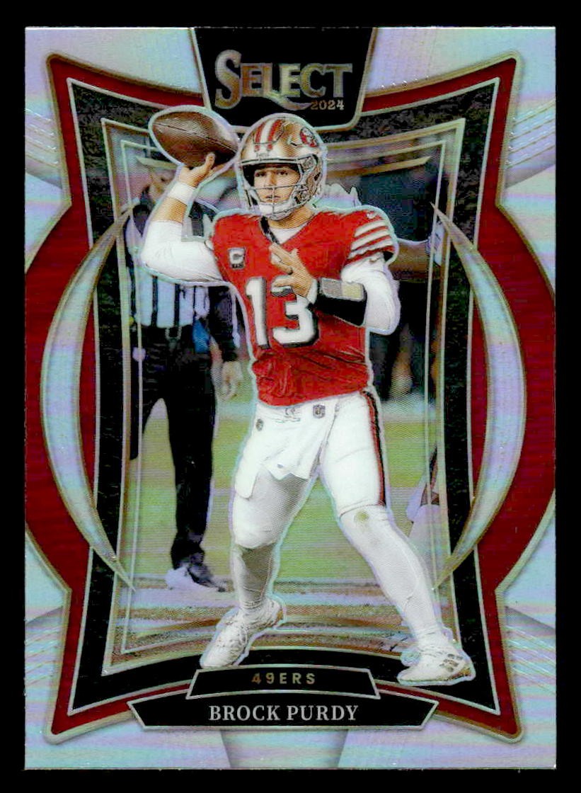 This is a nice example of a 2024 Panini Select #37 Brock Purdy Silver Prizm