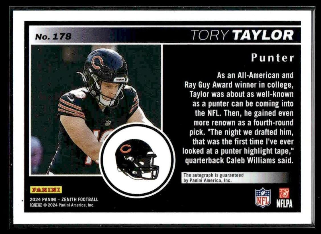 This is a nice example of a 2024 Panini Zenith #178 Tory Taylor Autographs No Huddle